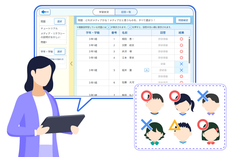 先生の画面では、児童の学習状況や問題の正誤を確認できます。