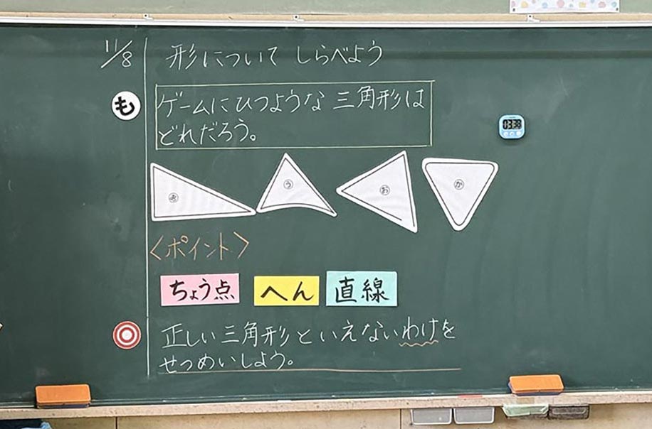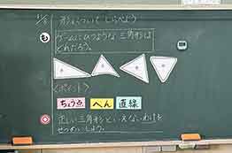 本単元は、三角形の特徴を正しく理解し、弁別したり進んで問題を解決しようとしたりする学習です。本単元では、様々な三角形を提示し、「三角形ではないと思うわけ」を見つけ、正しい三角形の特徴を考えていく場面でトラビを活用しました。