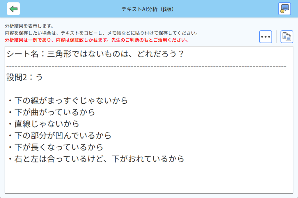 回答時に未習の漢字に変換してしまったり、誤字があったりすると、要約時にそのまま反映されてしまうことがあるので、全体で共有する際には丁寧に確認する必要があります。